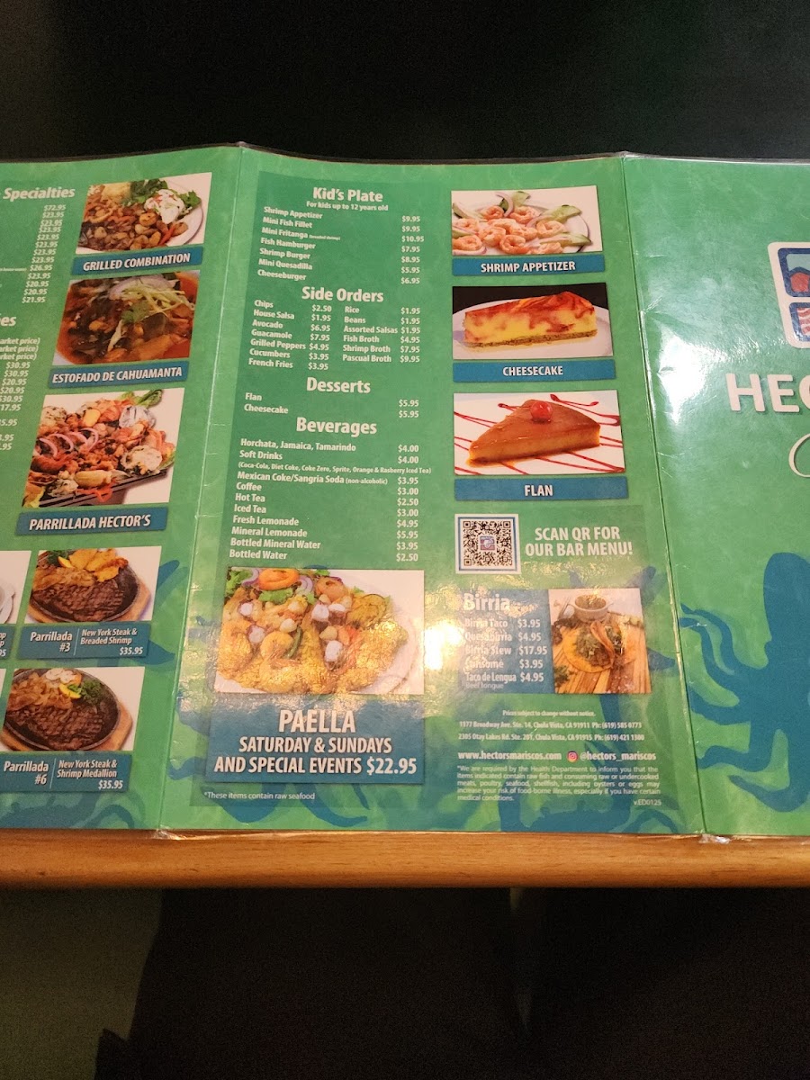 Overall, Hector's Mariscos stands out for its diverse menu that successfully blends Mexican and seafood cuisine, catering to all tastes and preferences. Whether you're looking for a light appetizer, a hearty main dish, or a sweet treat, this restaurant has something to offer for everyone.